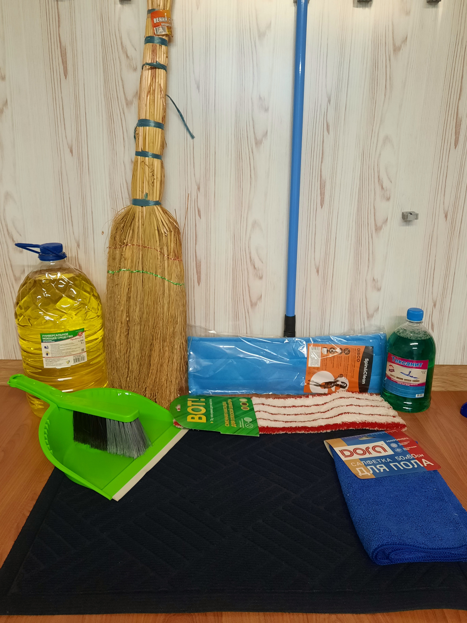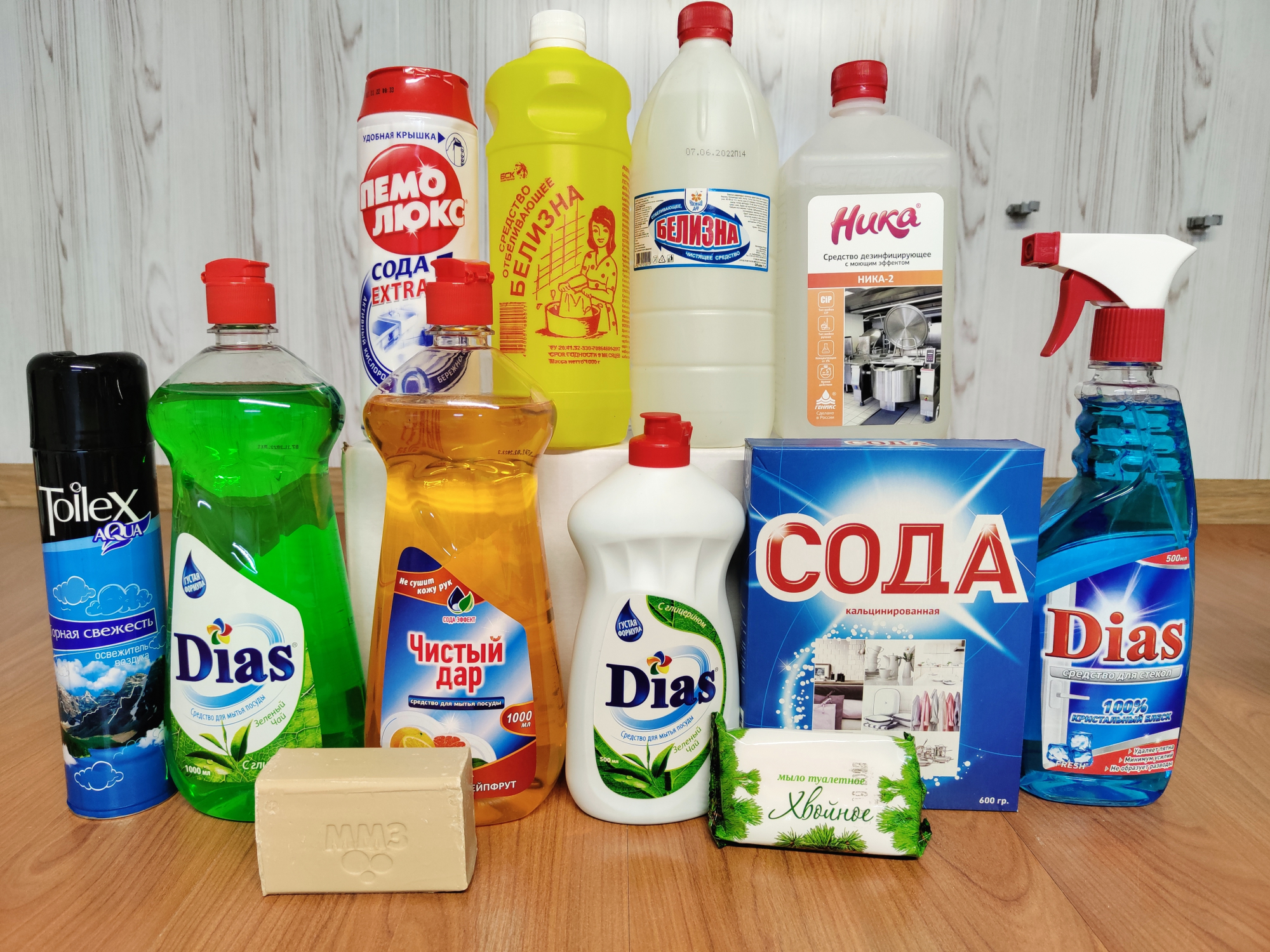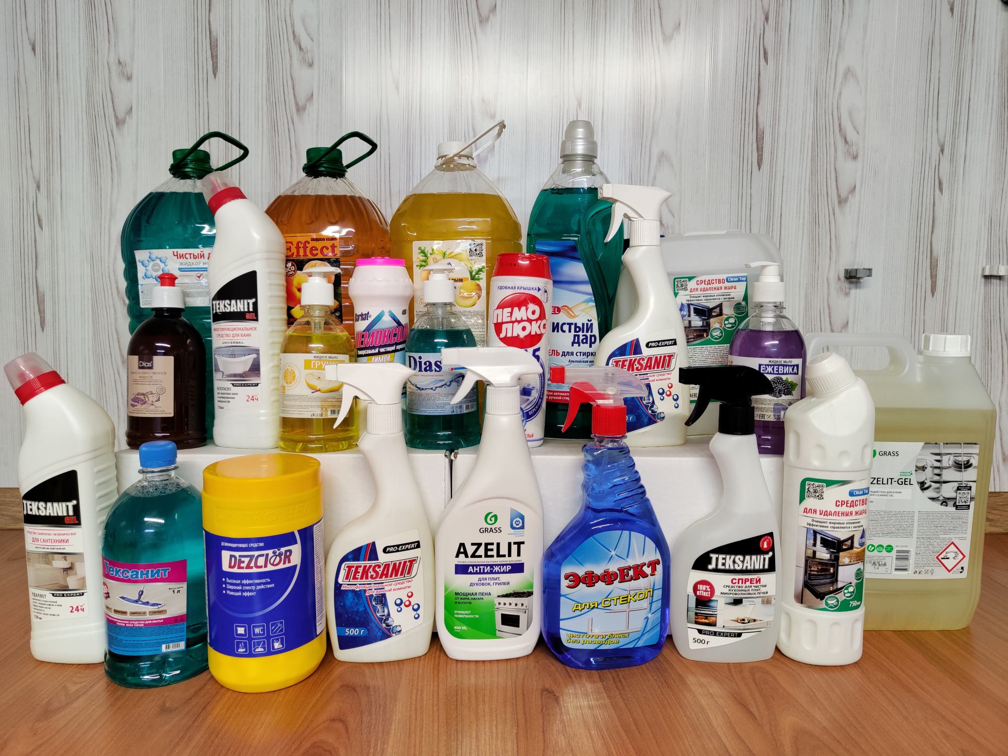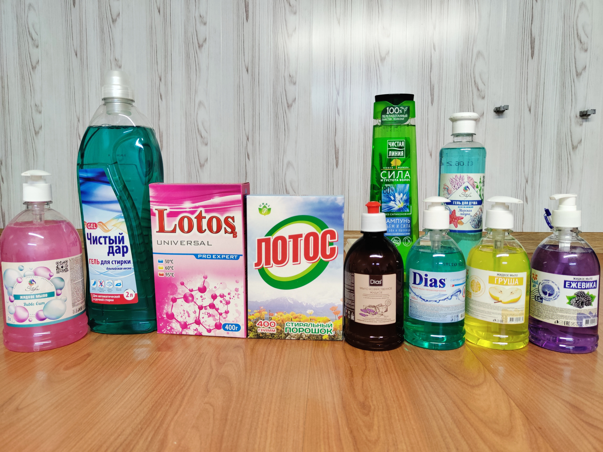 Широкий ассортимент бытовой химии, средства уборки.